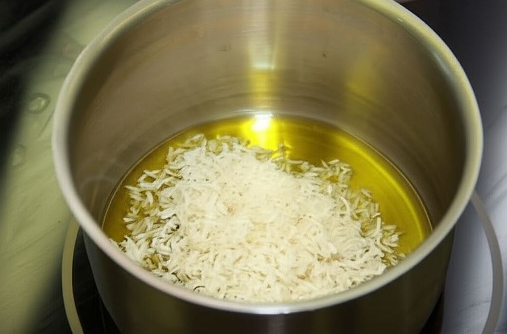 Przesmaż ryż w garnku (na oleju), aż stanie się szklisty.