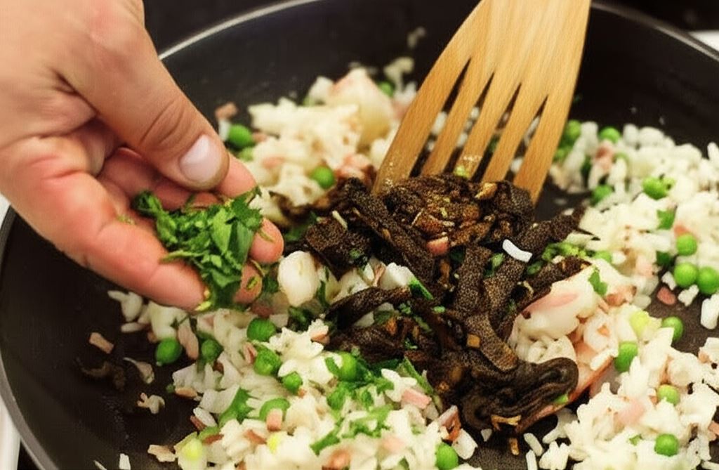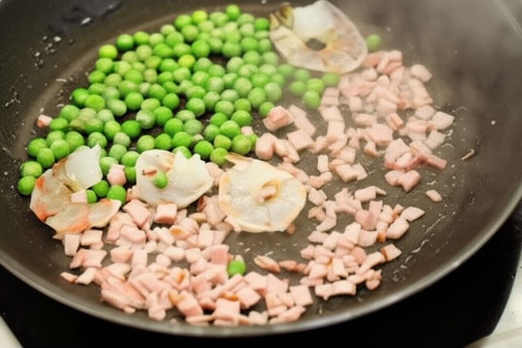 Podgrzej resztę oleju i zrumień krewetki, dodaj szynkę i groszek, po czym smaż 2 minuty stale mieszając. Potem wsyp pozostałą cebulkę i ryż.