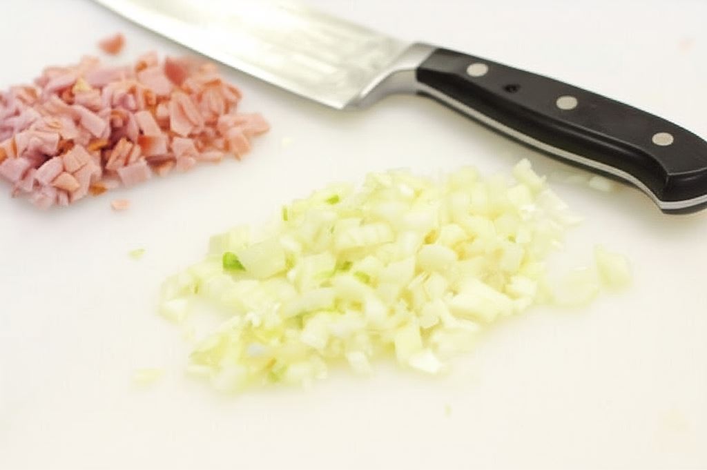 Cebule posiekaj drobno, a szynkę pokrój w kosteczkę.