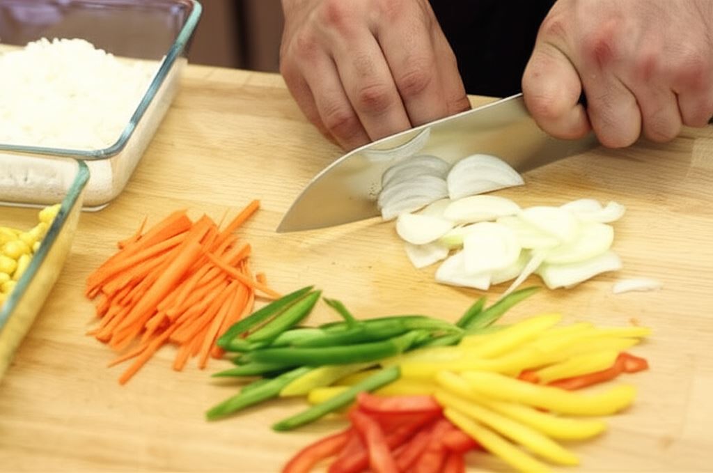 Przygotuj ryż. Wszystkie warzywa, papryki, cebulę i marchewkę potnij w paski. Kukurydzę odlej.