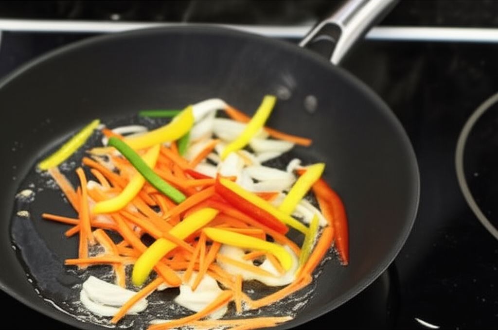Rozgrzej olej na dużej patelni i podsmaż warzywa.