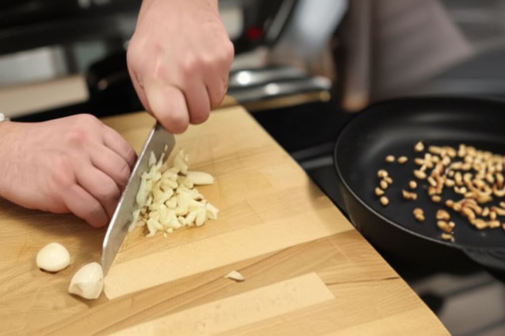 Posiekaj ząbki czosnku, zrumień orzeszki do złotego koloru.