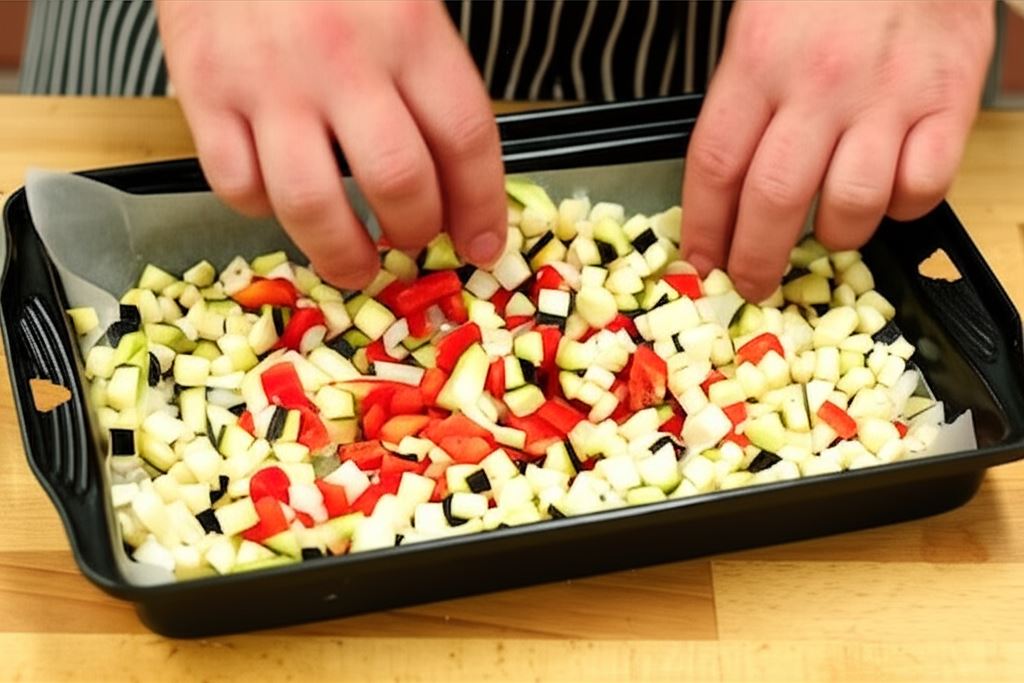 Cebulę, bakłażana i czerwoną paprykę pokrój w drobną kostkę o boku pół centymetra. Rozłóż warzywa na papierze do pieczenia i umieść w piekarniku rozgrzanym do 190°C na około 20 minut.