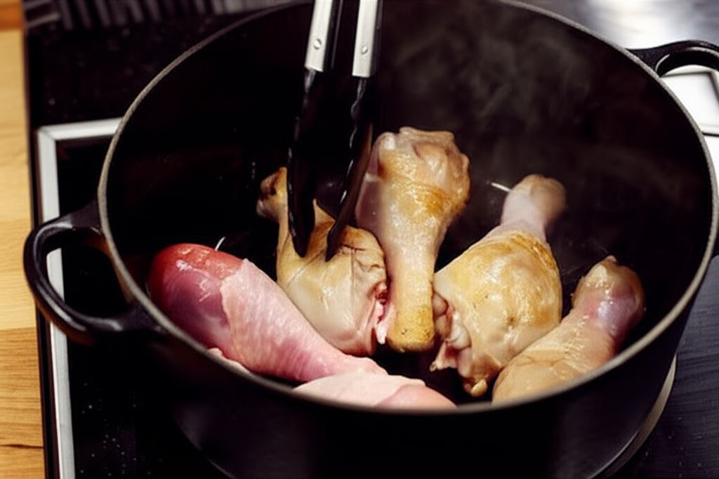 W tym czasie, w płytkim rondlu o szerokim dnie zrumień na gorącej oliwie podudzia kurczaka.