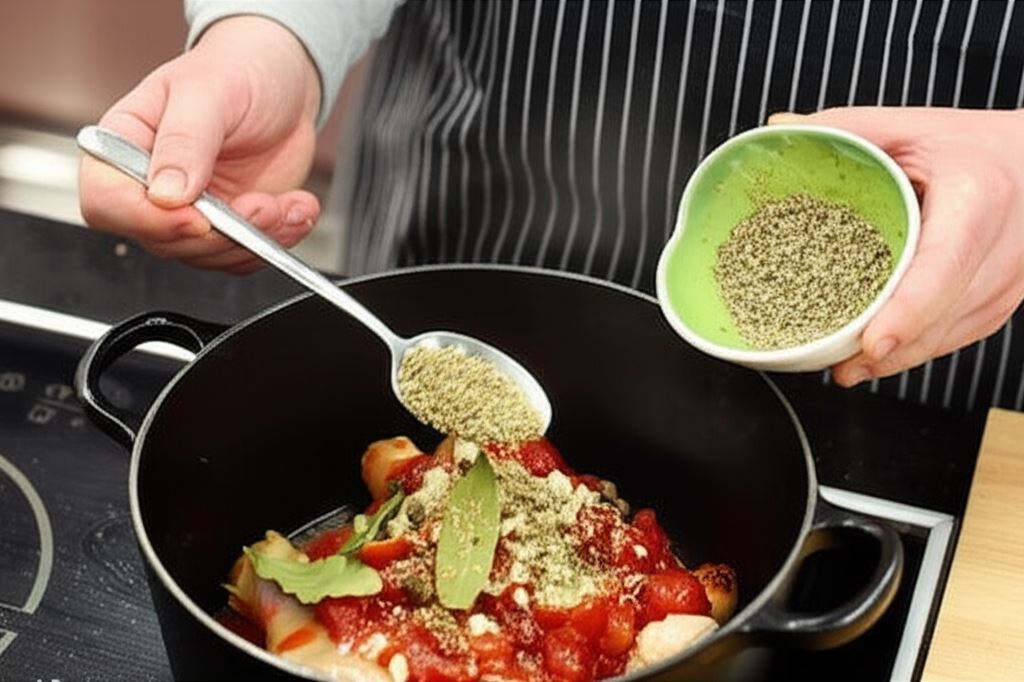 Wrzuć do nich pomidory pelati, czosnek, przyprawy, ziele angielskie, liść laurowy, mieszankę Knorr oraz kostki rosołowe.