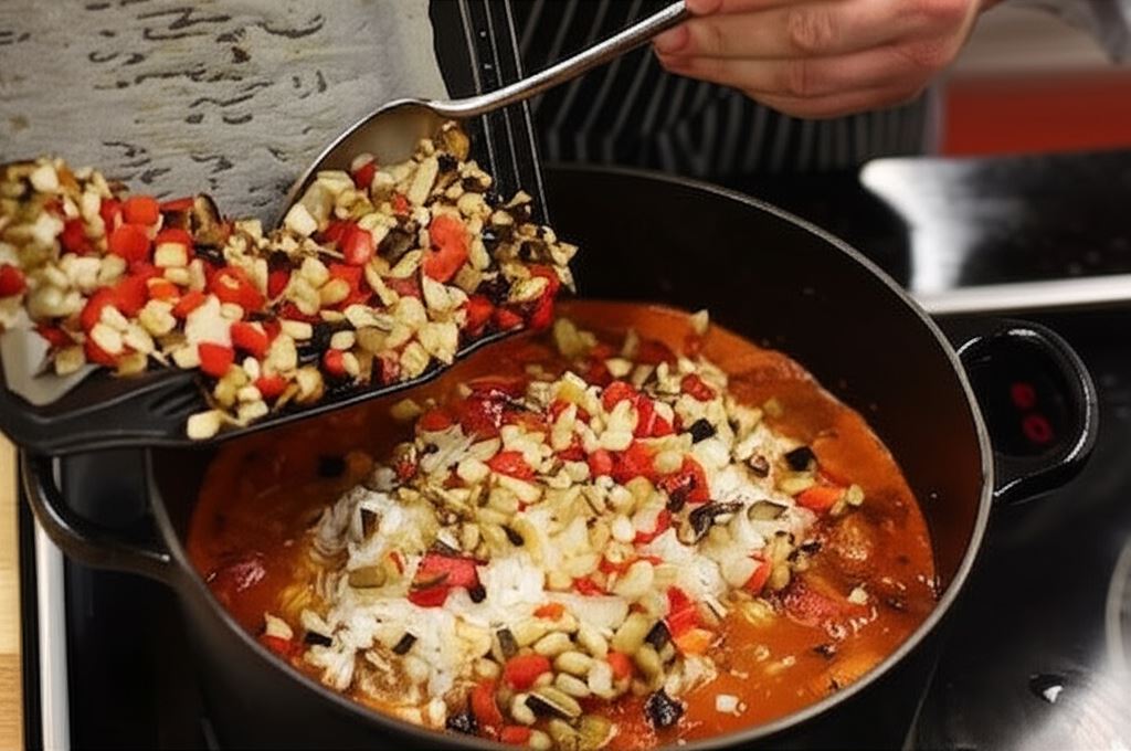 Całość zalej około 800 ml wody i gotuj przez ok. 15 minut, dokładnie wszystko mieszając. Do mięsa wsyp ryż oraz upieczone wcześniej warzywa.