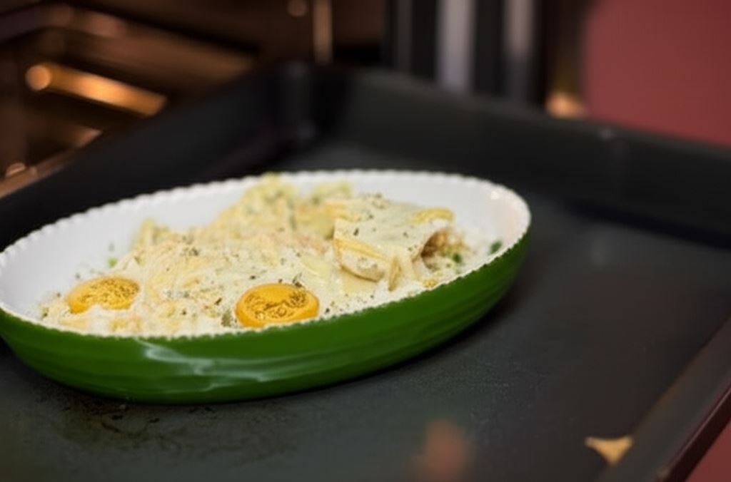 Kiedy jajka się zetną, polej śmietaną zmieszaną z utartym serem i umieść ponownie w piekarniku na 10 minut.