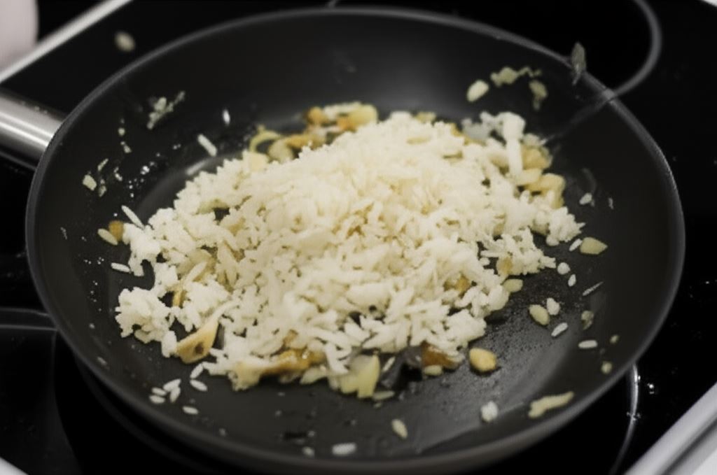 Na rozgrzanym tłuszczu podsmaż cebulę, czosnek i pieczarki. Połącz z ugotowanym ryżem.