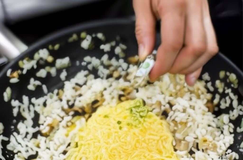 Ser zetrzyj na tarce o drobnych oczkach. Jajka ubij i wsyp razem z serem do ryżu z pieczarkami. Przypraw rozdrobnionymi mini kostkami Knorr oraz pieprzem i zamieszaj.