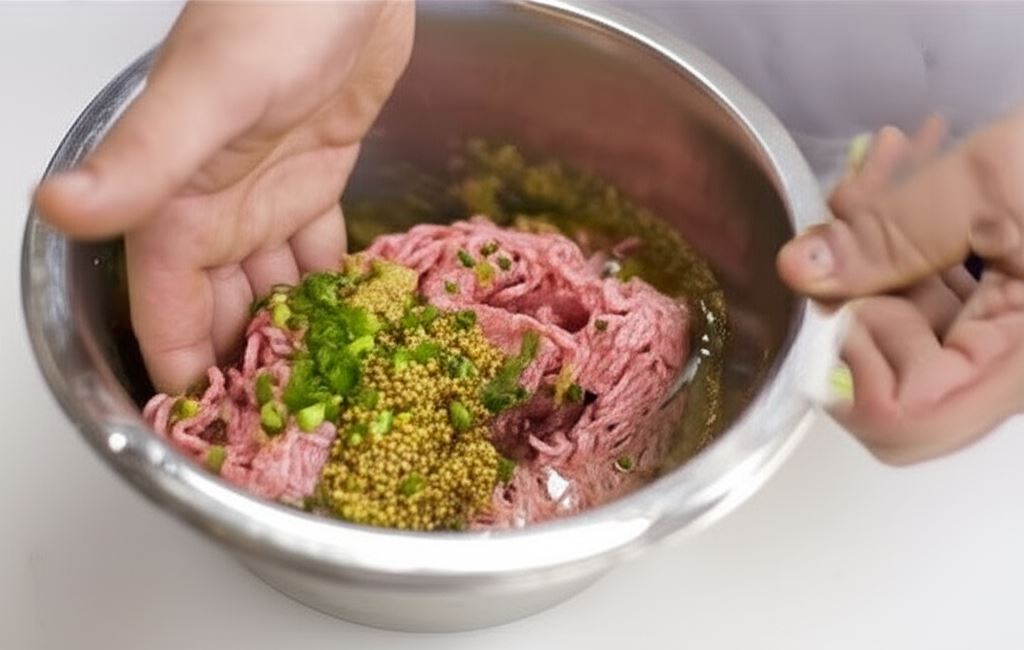 Wymieszaj go z mielonym mięsem, musztardą, białkami jaj i połową dymki. Wyrabiaj starannie dłońmi.