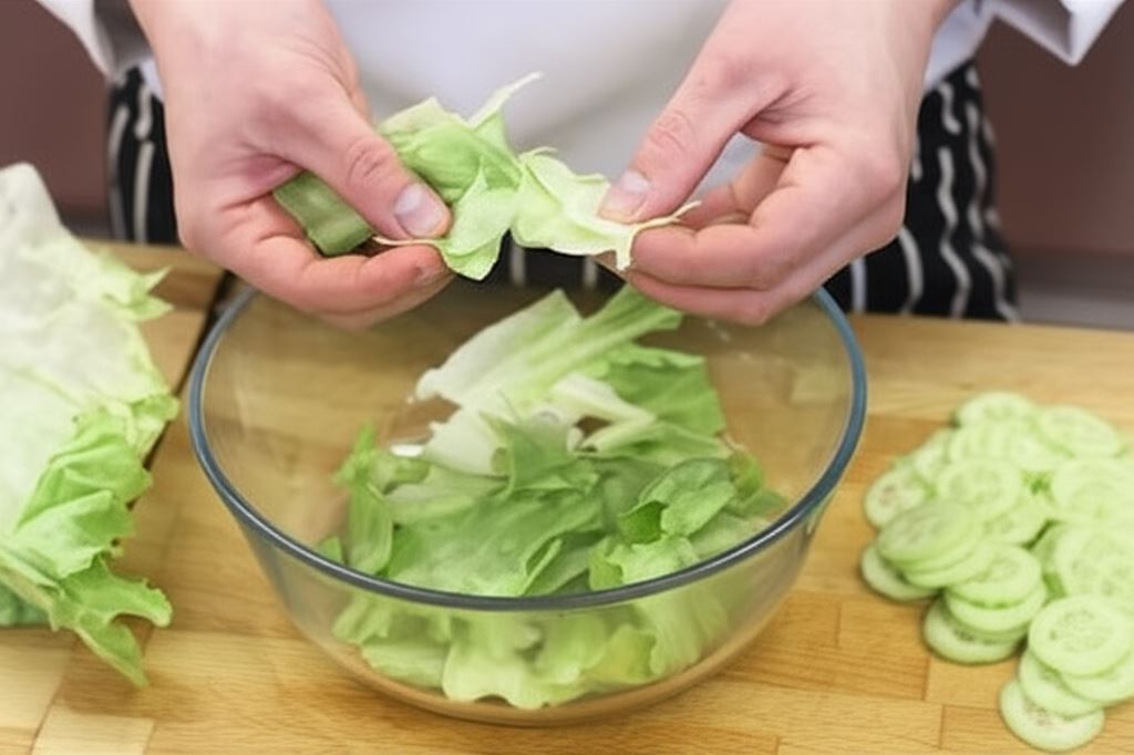 Ogórki starannie umyj, obierz i potnij w plasterki. Sałatę lodową podrzyj na drobniejsze kawałki.