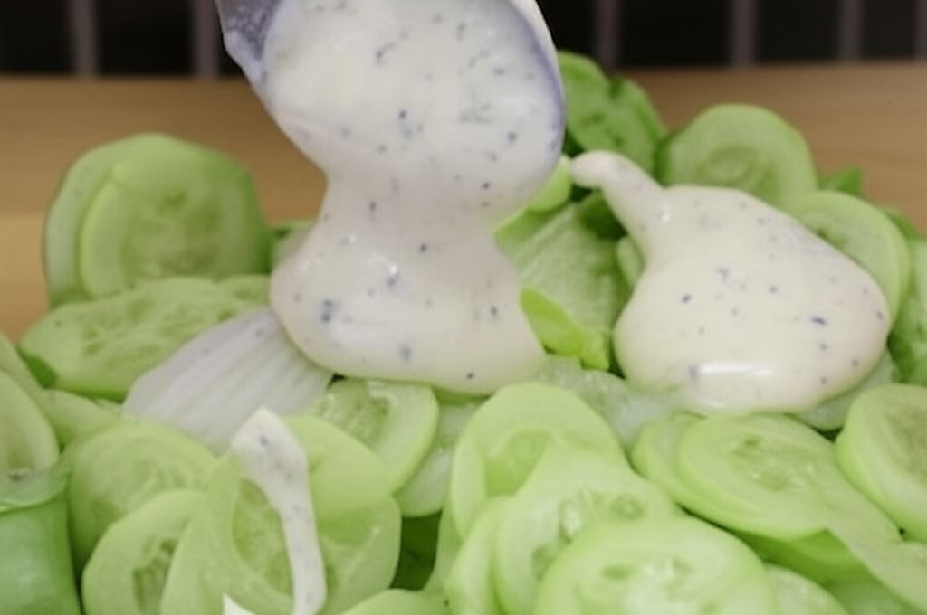 Wymieszaj sos z sałatą i ogórkiem. Umieść sałatkę na talerzu lub w miseczce.