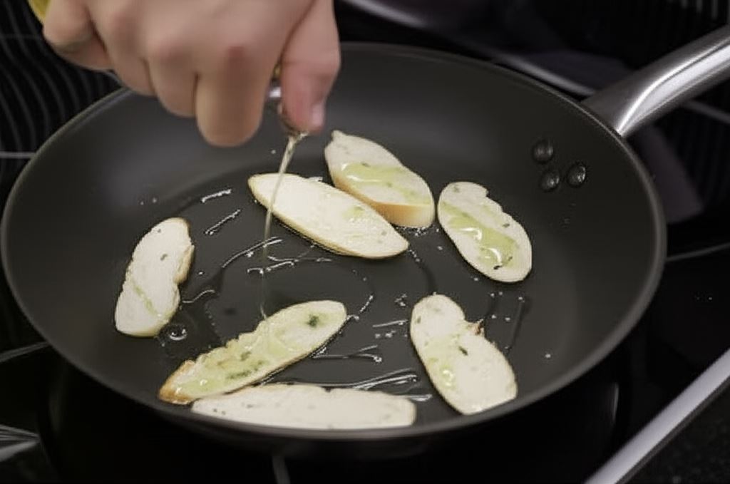 Bagietkę przekrój na cienkie plastry, polej oliwą, przypraw i przygotuj grzanki. Podaj z nimi sałatkę. Możesz ozdobić ją natką pietruszki.