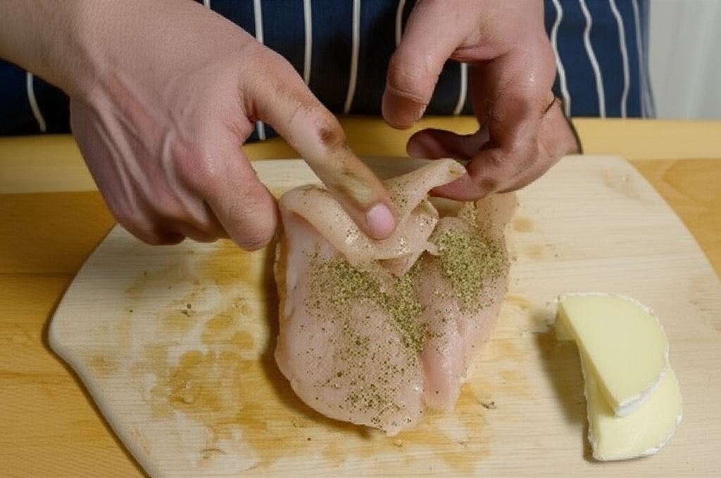 Przekrój na pół wzdłuż połowę sera camembert. Mięso natnij wzdłuż boku – uformuj kieszeń. Przypraw wewnątrz delikatnie ziołami prowansalskimi, solą i pieprzem.