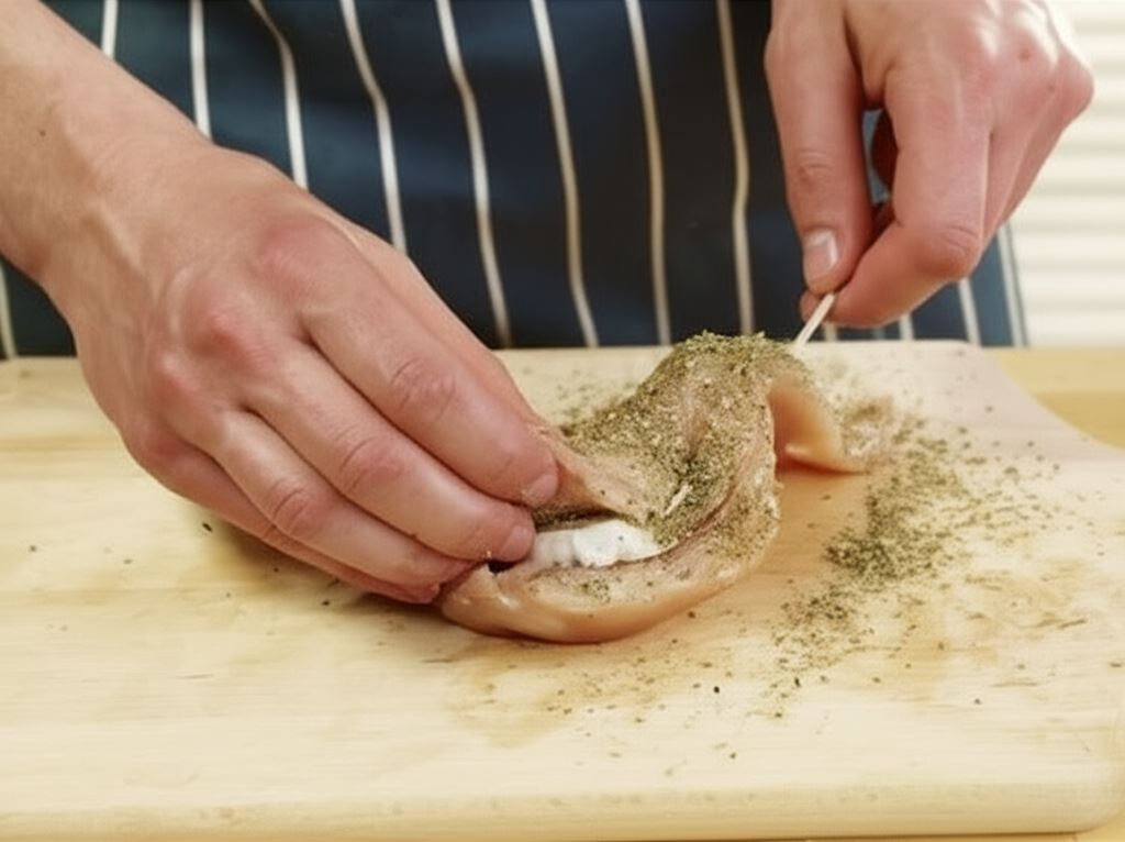 Do wnętrza włóż ser i krawędź mięsa połącz wykałaczką. Kurczaka polej oliwą, oprósz delikatnie ziołami, solą i pieprzem. Pozostaw na 10 minut.