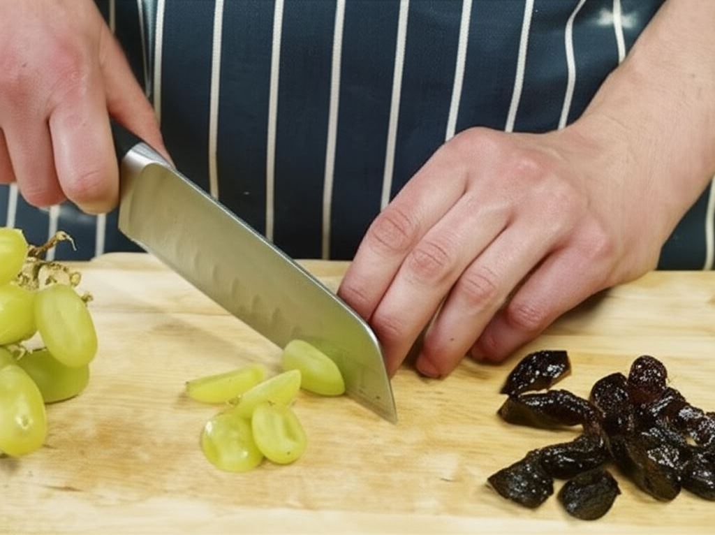 W międzyczasie przygotuj owoce i warzywa. Śliwki oraz winogrona przekrój na połówki i usuń pestki.