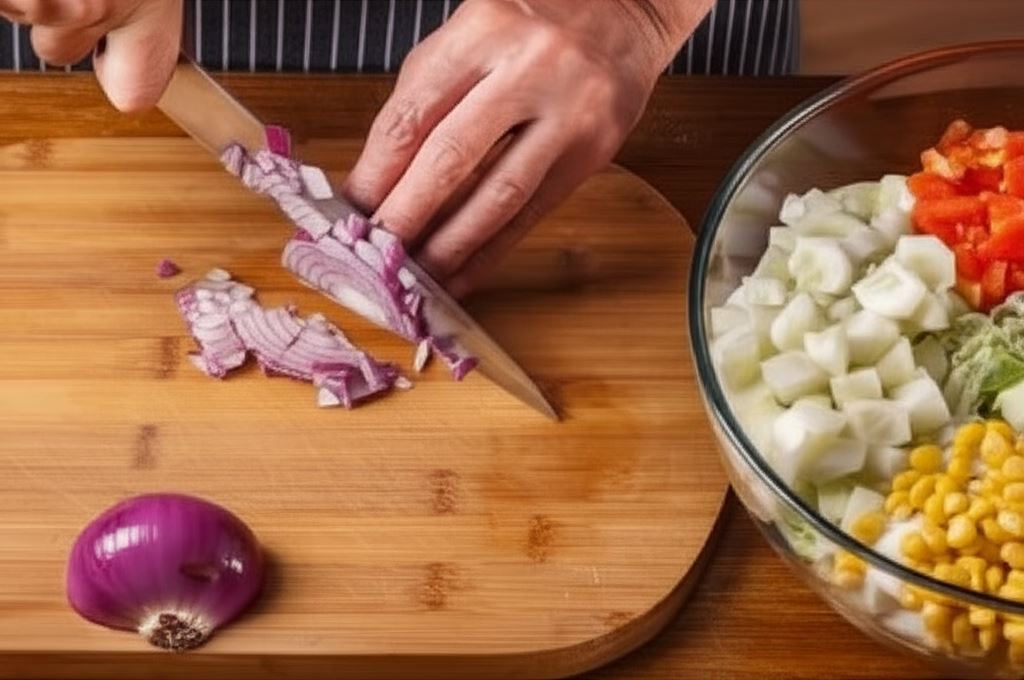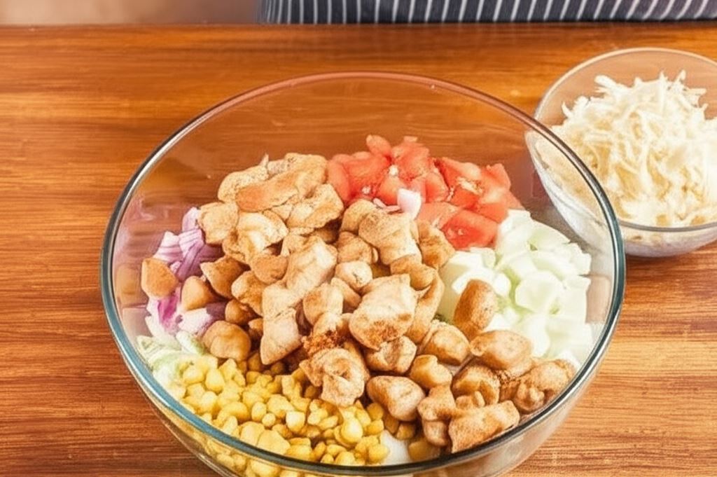 Pekińską kapustę poszatkuj, pomidory, ogórki i cebulę pokrój w kostkę, wsyp kukurydzę i dodaj kawałki kurczaka z piersi.