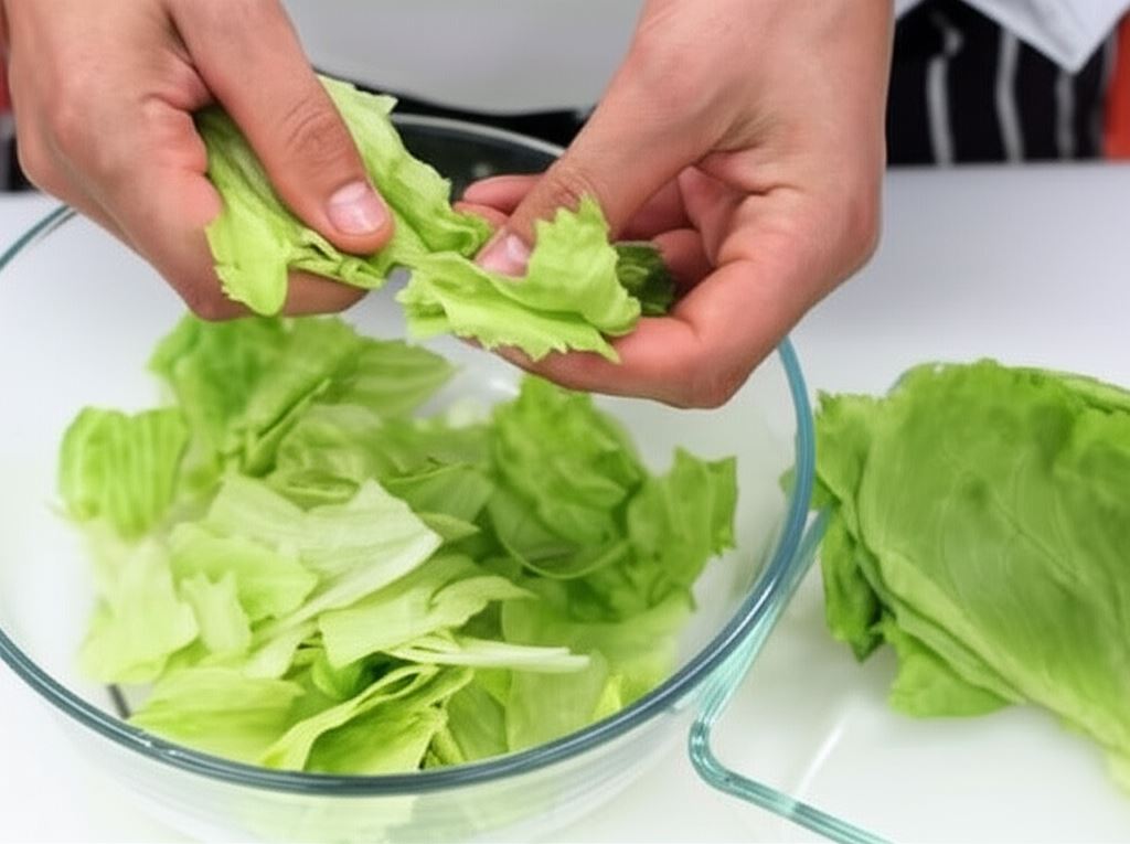 Sałatę opłucz, rozdziel na pojedyncze liście i wysusz, po czym podrzyj na drobniejsze części.