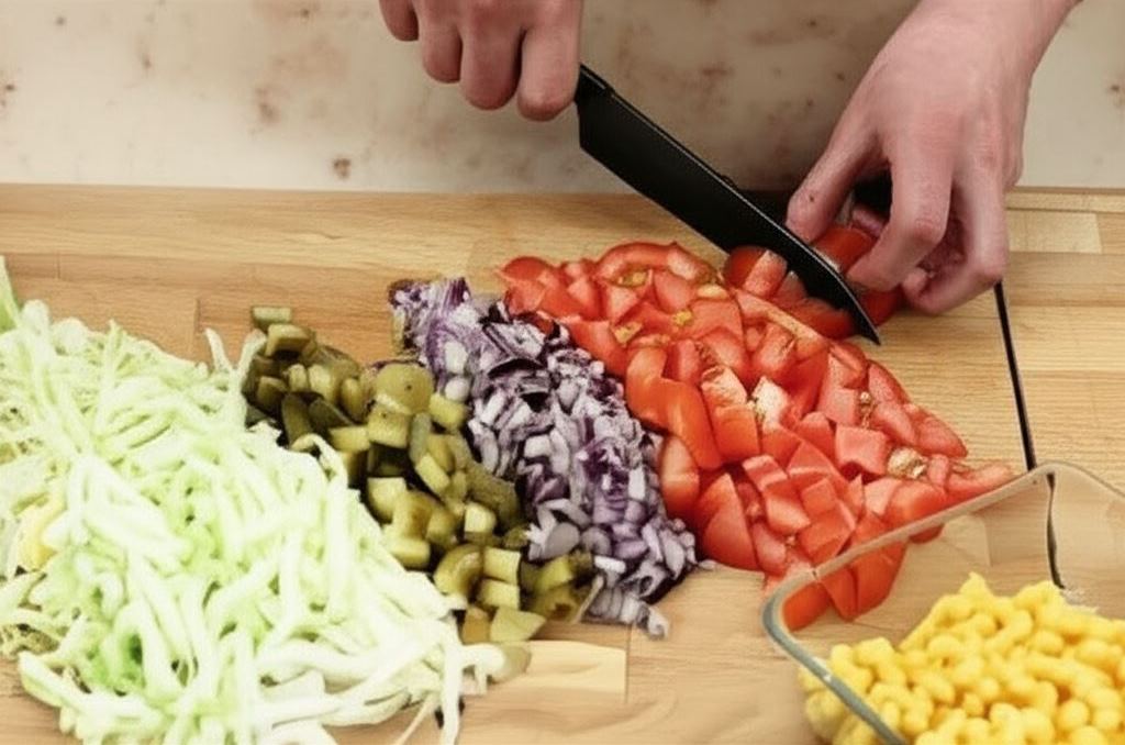 Przygotowanie jest banalnie proste – wystarczy pokroić mięso w paski, przyprawić Fixem Knorr i usmażyć. Następnie przygotować sos, mieszając Ketchup Hellmann’s Pikantny z Majonezem Babuni i sosem czosnkowym. Warzywa – kapustę, pomidory, cebulę, ogórki i kukurydzę – układamy warstwowo, przekładając je mięsem i sosem.
