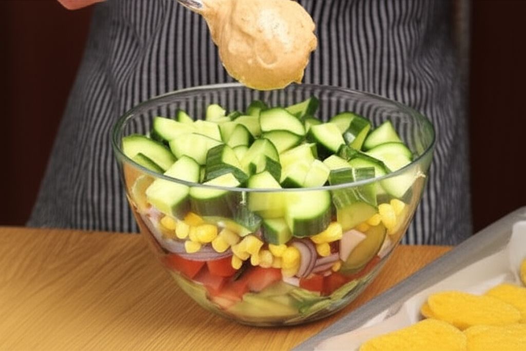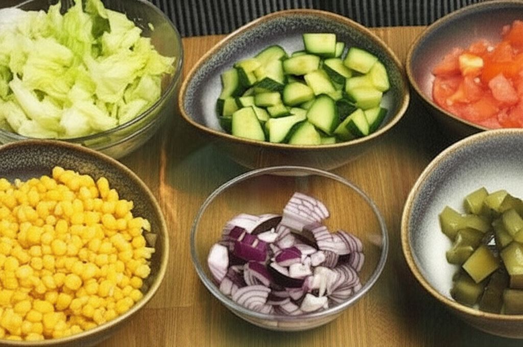 Przygotowanie jest niezwykle proste – wystarczy upiec roślinne nuggetsy w piekarniku, przygotować aromatyczny sos z wegańskiego majonezu i przyprawy do gyrosa Knorr, a następnie warstwowo ułożyć świeże składniki. Na dnie salaterki umieść liście sałaty, a na nich kolejno pomidory, ogórki kiszone, czerwoną cebulę, kukurydzę i ogórki zielone. Całość zwieńcz sosem i upieczonymi nuggetsami.