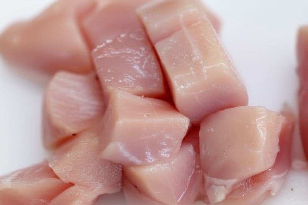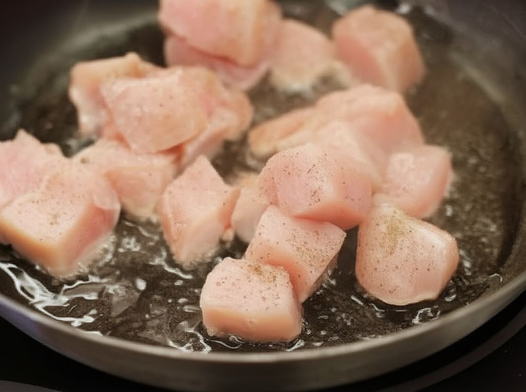 Pierś kurczaka przepłucz pod zimną wodą, wysusz papierowym ręcznikiem, potem oczyść i pokrój w kostkę. Pokrojonego kurczaka zamarynuj delikatnie w soli i pieprzu.