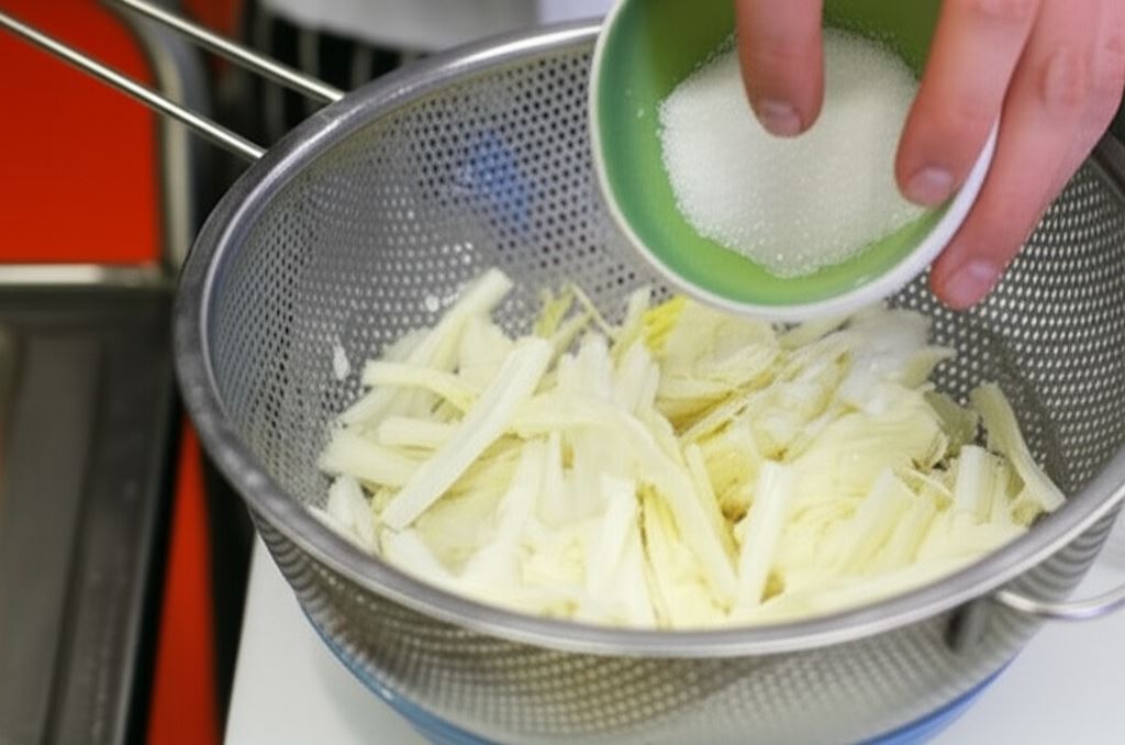 Kapustę pekińską poszatkuj w paski, posyp cukrem i pozostaw na sicie, by oddała soki.