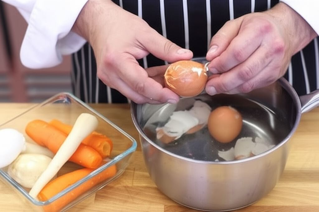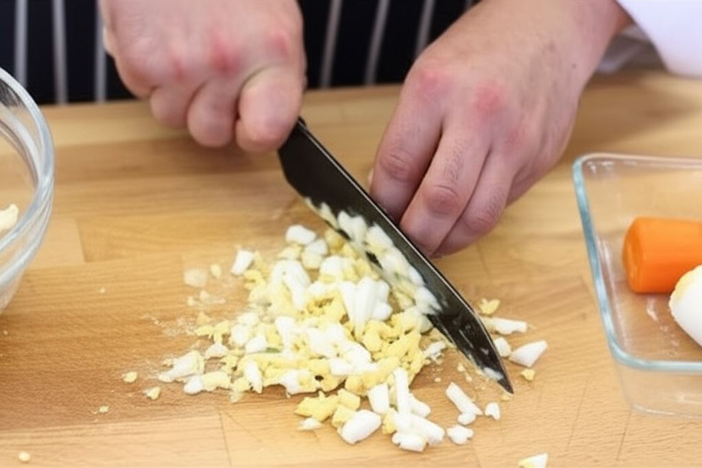 Włoszczyznę oczyść, obierz i ugotuj aż zmięknie. Jajka ugotuj na twardo.