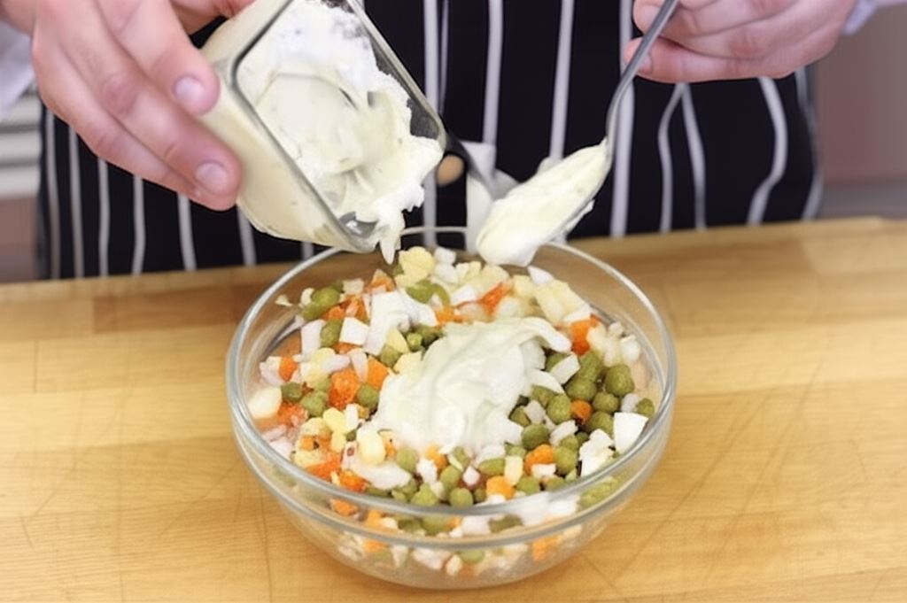 Eksperymentuj ze składem! Zamiast szynki możesz dodać ser żółty lub kawałki śledzia. Podstawą zawsze pozostaną jajka na twardo, ogórki kiszone, groszek konserwowy (lub kukurydza) i ugotowana włoszczyzna. Sałatkę podawaj z białym pieczywem, które doskonale komponuje się z jej kremową konsystencją.