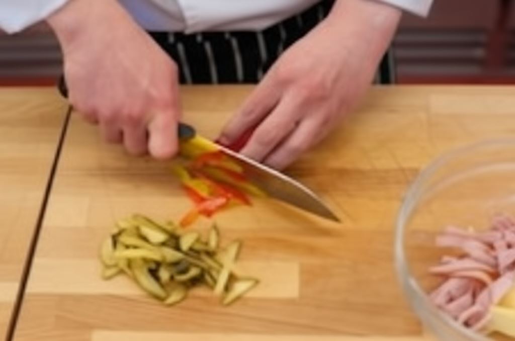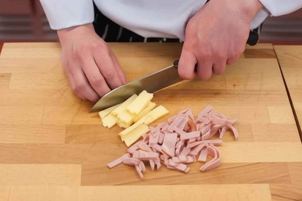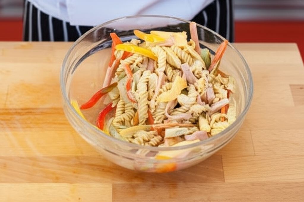 Szynkę i ser potnij w paski. Makaron ugotuj.