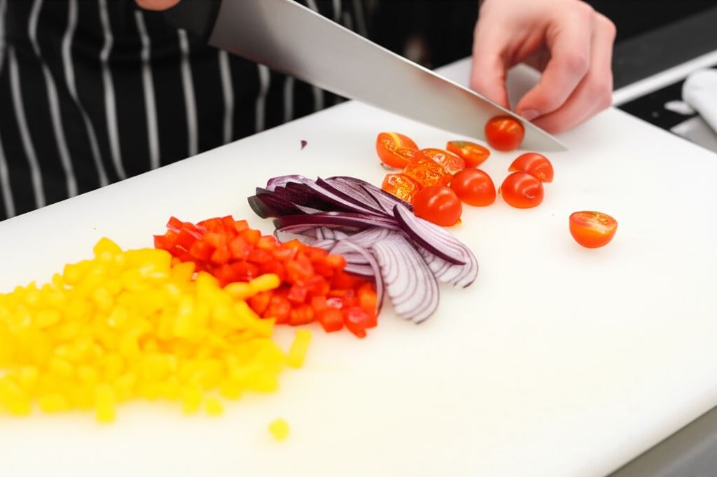 Papryki opłucz i posiekaj w małą kostkę, cebulę w piórka, a pomidorki cherry na połówki.