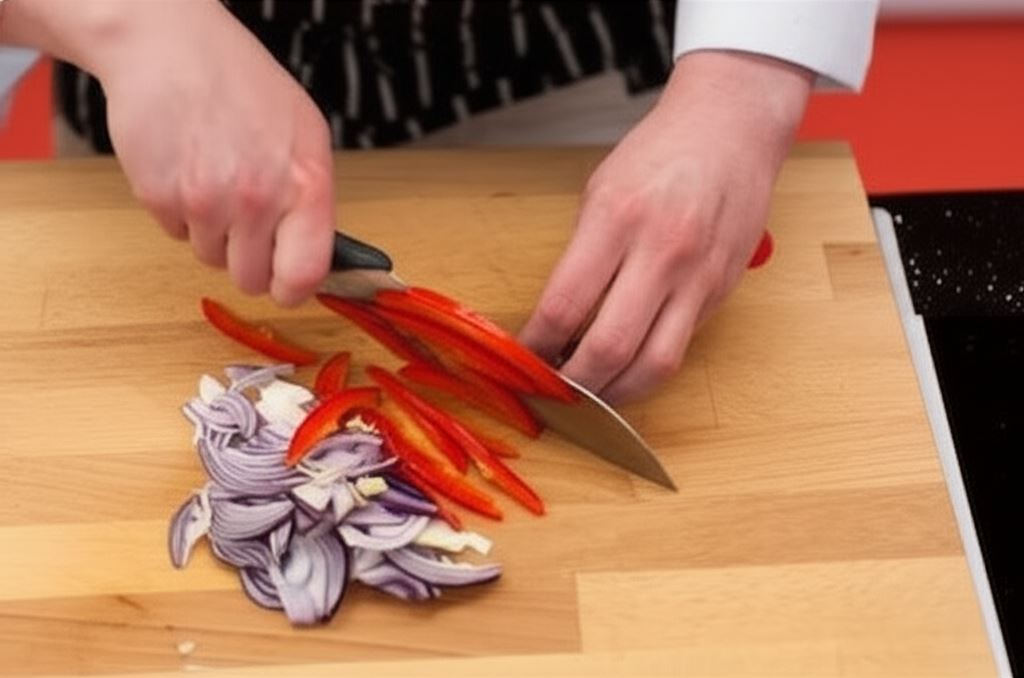 Paprykę potnij na cienkie paski, a cebulę pokrój w piórka.