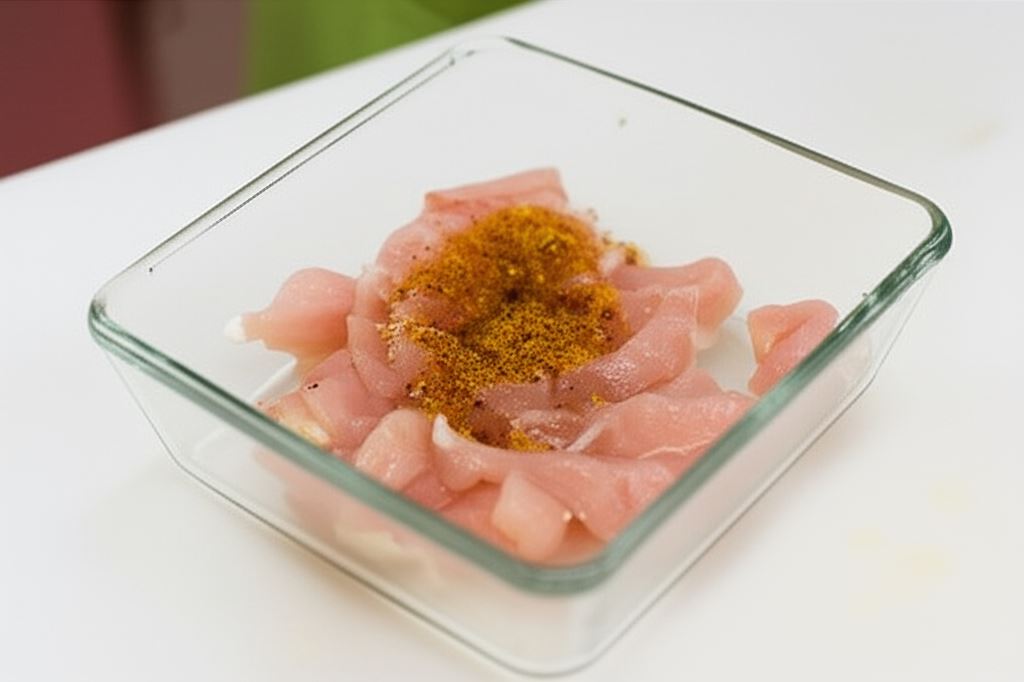 Kurczaka pierś potnij w paski i posyp Przyprawą do kurczaka Knorr. Potem przysmaż na mocno nagrzanej patelni lub grillu. Odłóż do wystudzenia.