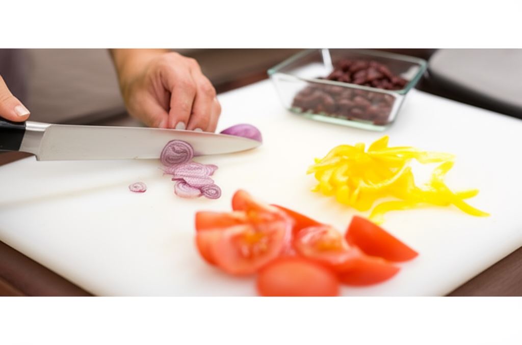 Czerwoną fasolę odcedź z zalewy i opłucz. Paprykę potnij w cienkie paski, pomidory w cząstki, cebule w piórka.