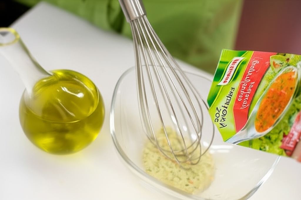 Sos sałatkowy paprykowo-ziołowy Knorr zmieszaj z wodą, a następnie dodaj oliwę.