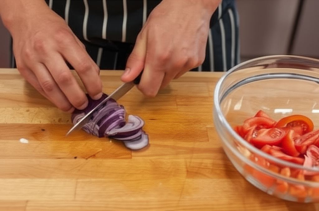 Pomidory dokładnie umyj i pokrój na kawałki. Cebulę pokrój w półplasterki.