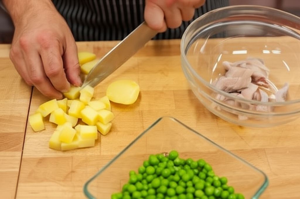 Śledzie potnij ukośnie na paski o grubości centymetra, ziemniaki w kostkę podobnej grubości, a groszek odmroź.
