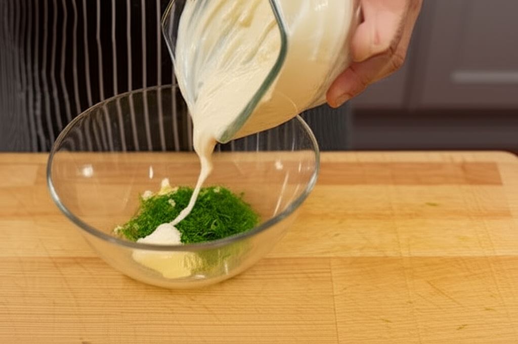 Sporządź sos: w miseczce wymieszaj majonez, musztardę, koperek i sok z cytryny – połącz wszystko starannie.