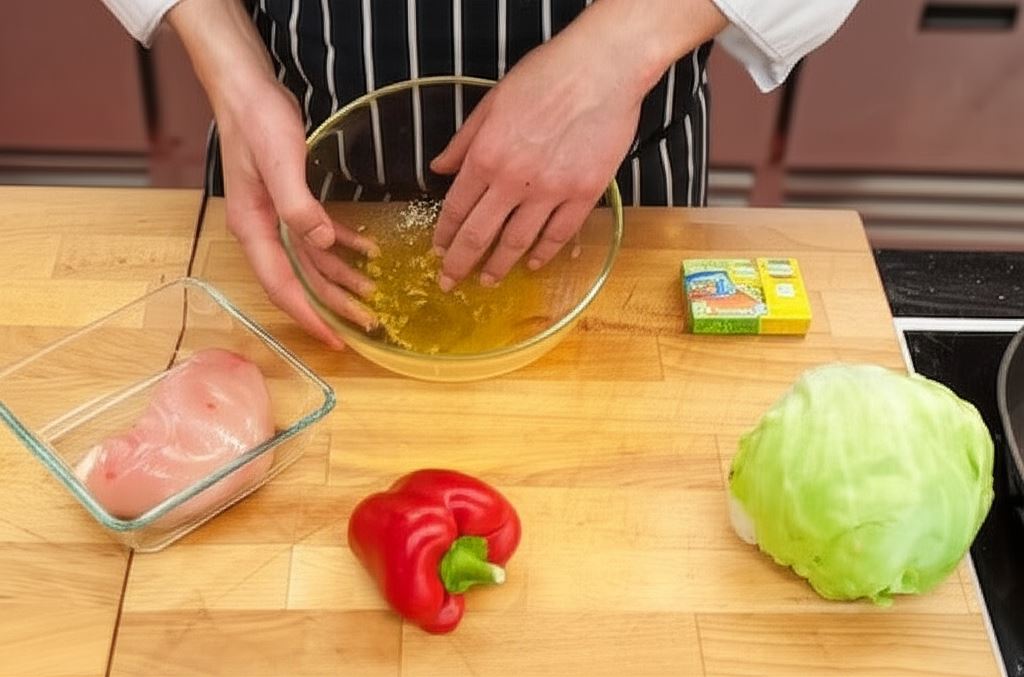 Wymieszaj kostkę rosołową z oliwą. W przygotowanej w ten sposób marynacie umieść piersi kurczaka i smaż na patelni przez około 5 minut z każdej strony.
