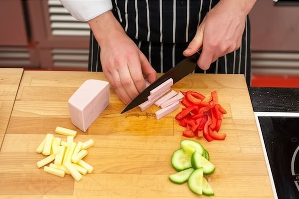 Pokrój paprykę, ser żółty, szynkę i ogórka w słupki o podobnej grubości jak kawałki piersi kurczaka.