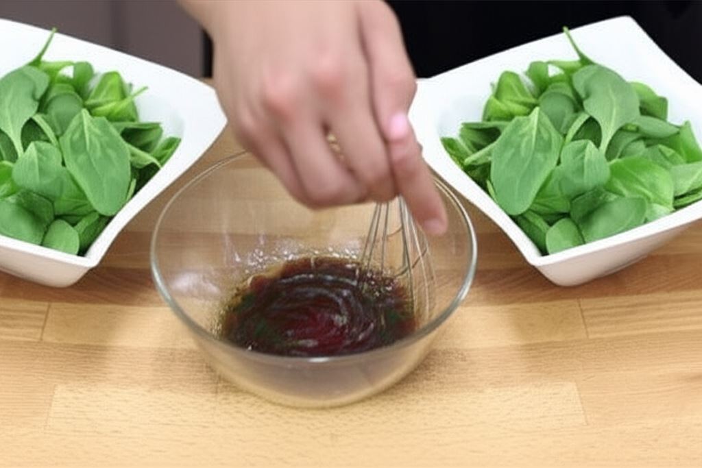 Szpinak opłucz w zimnej wodzie i odcedź. Umieść w salaterce. Przygotuj intensywny w smaku sos mieszając zawartość opakowania Knorr z trzema łyżkami wody, oliwą oraz sokiem malinowym.