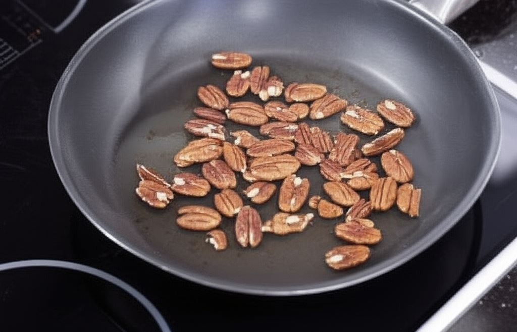 Orzechy podpraż na nagrzanej suchej patelni. Potem ostudź i rozdrobnij na mniejsze kawałki.