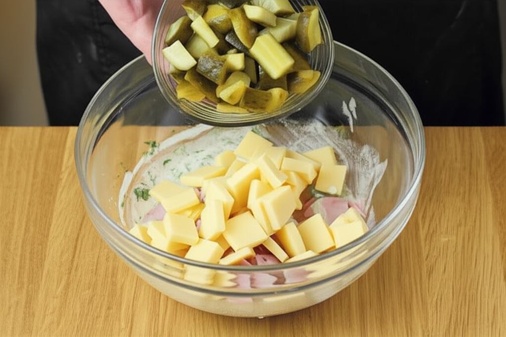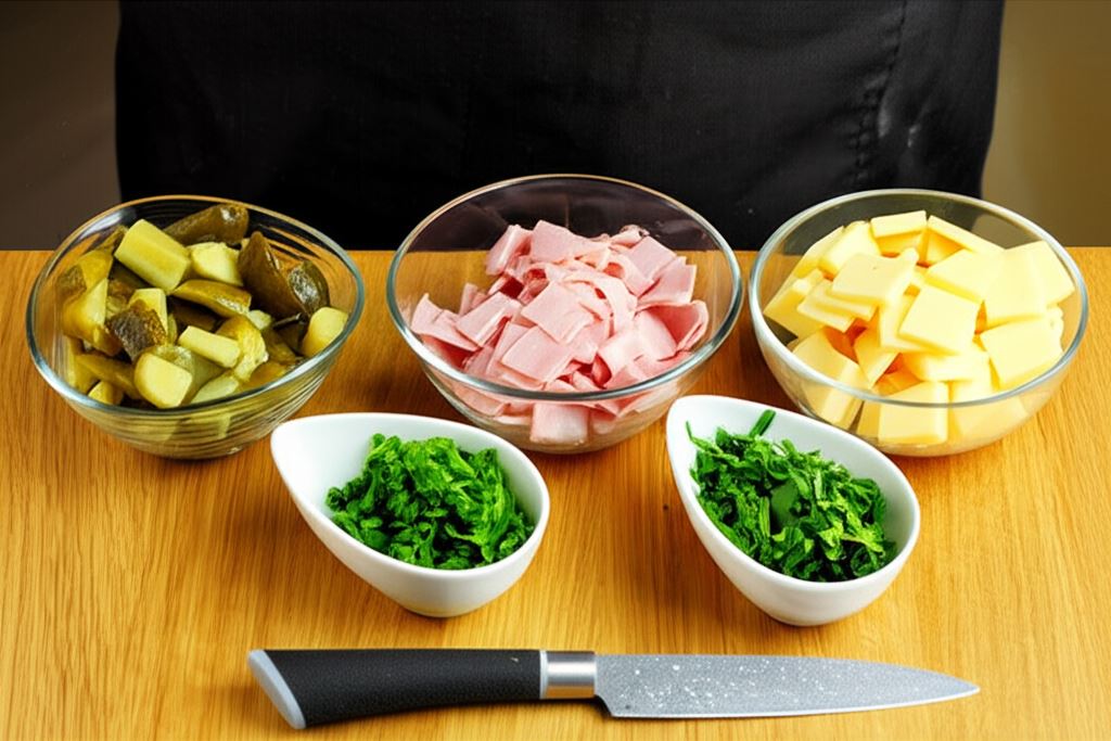 Posiekaj drobno natkę pietruszki i szczypiorek, pokrój w kostkę szynkę, ser oraz ogórki.