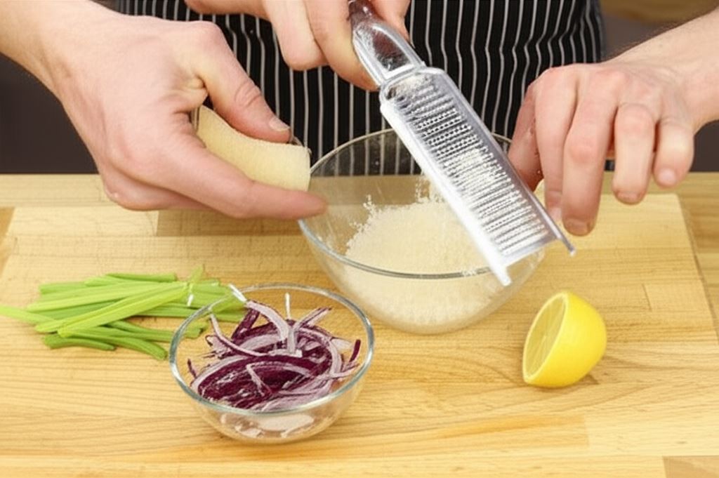 Czerwoną cebulę pokrój na cienkie półkrążki, a szczypior posiekaj w zapałkę (około 4 cm kawałki). Parmezan zetrzyj na tarce, wyciśnij sok z cytryny.