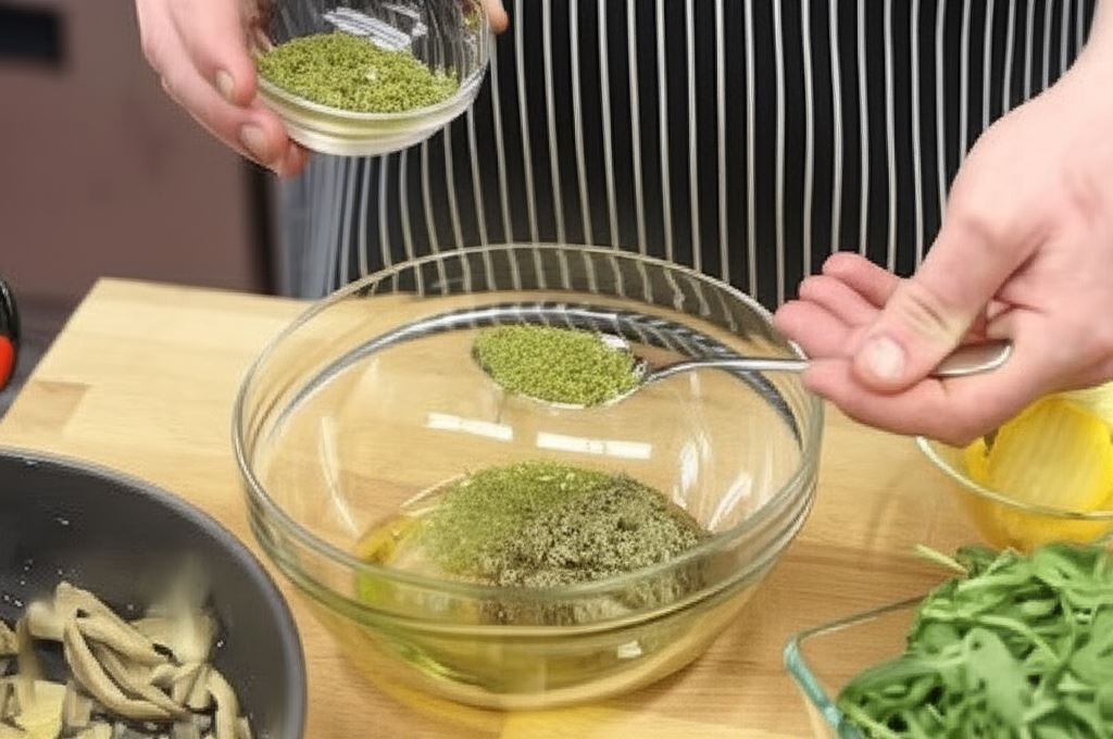 W misce połącz oliwę truflową z sosem sałatkowym, sokiem z cytryny oraz pesto.