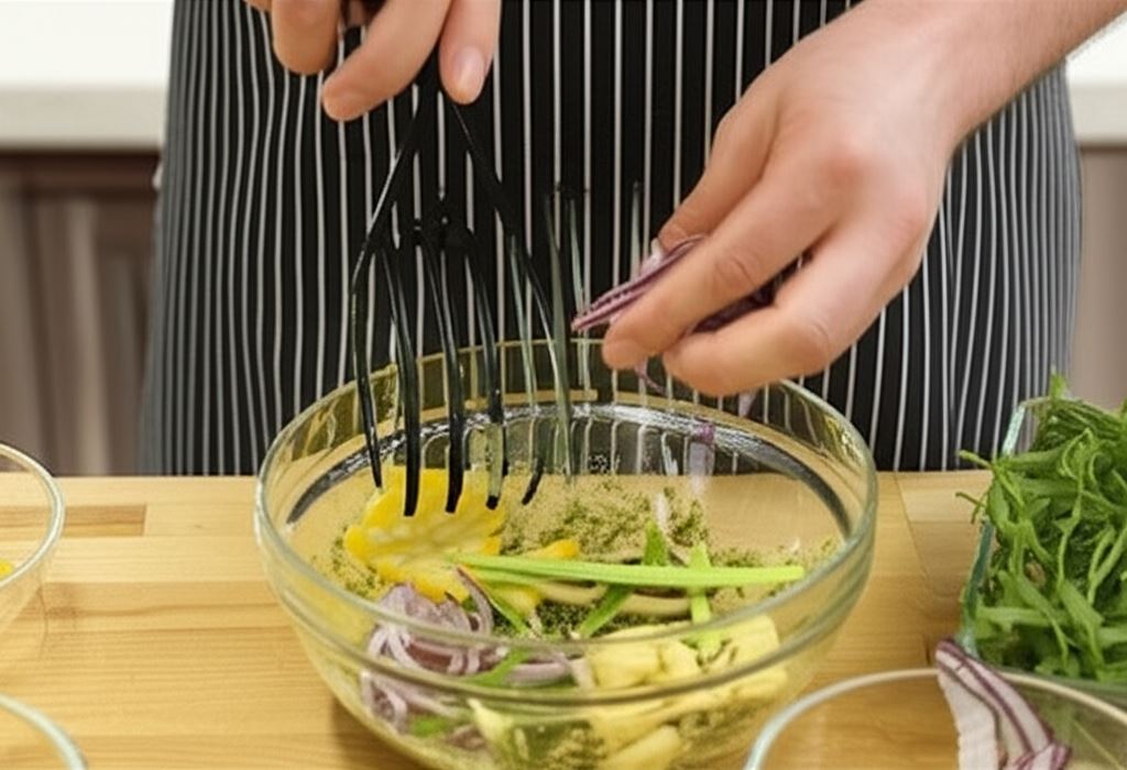 Wymieszaj wszystkie składniki w tak uzyskanym sosie. Odstaw sałatkę w chłodne miejsce na minimum jedną godzinę, aby składniki przeniknęły się smakiem.