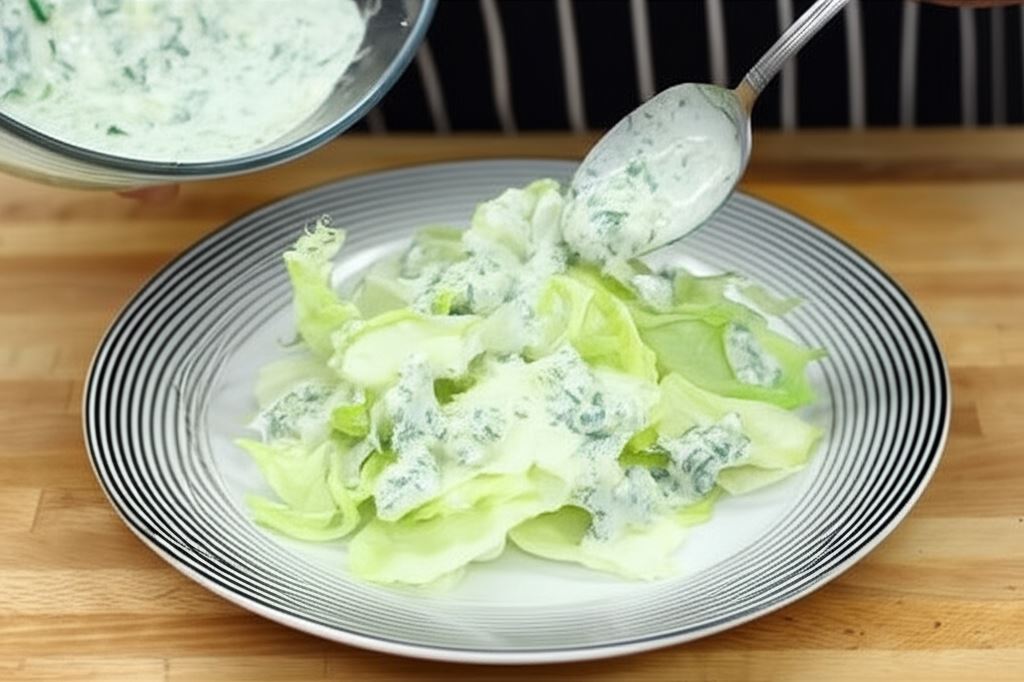 Sałatę rozłóż na talerzu i skrop sosem tzatziki.