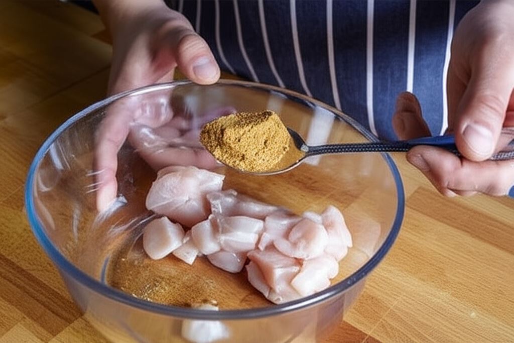 Kurczaka pierś pokrój w kostkę i przyprawą Knorr dopraw. Smaż na patelni z olejem dopóki mięso stanie się miękkie i smaczne.