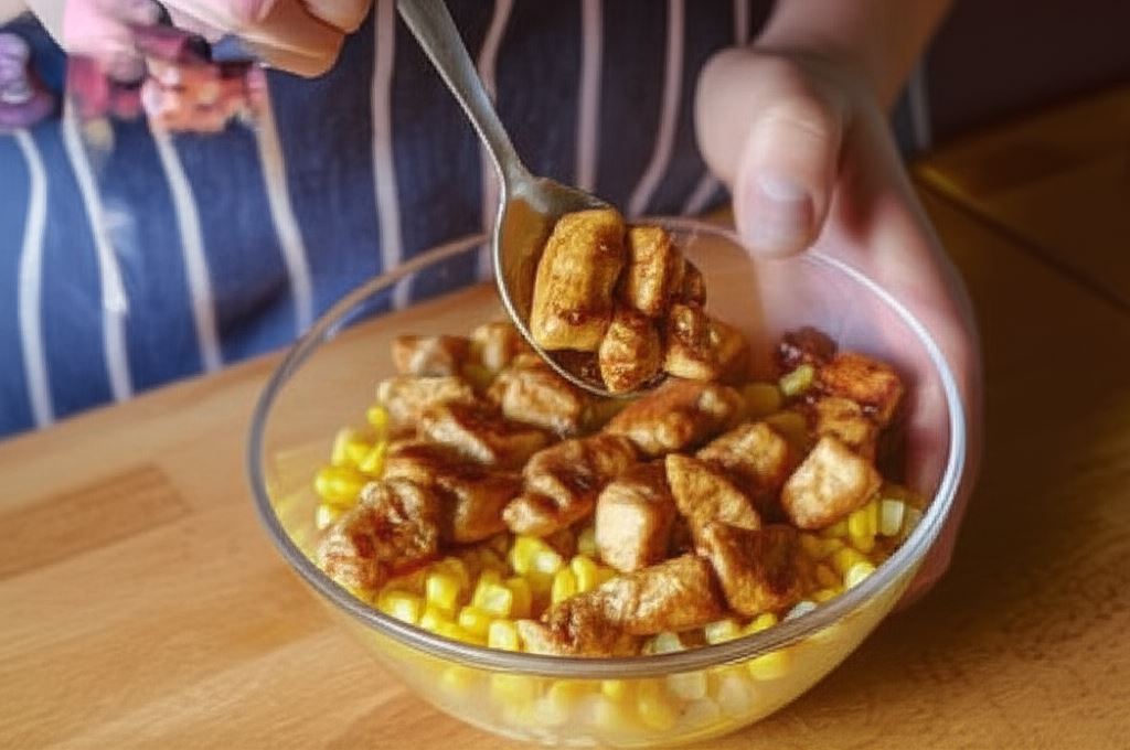 Następne warstwy składają się z marchewki, sosu majonezowego, kurczaka, ogórków, kukurydzy i majonezu.