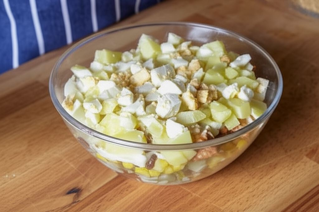 Sekret tej wyjątkowej sałatki tkwi w starannym układaniu warstw w tortownicy, dzięki czemu po odwróceniu otrzymujemy efektowne danie, które wygląda jak profesjonalny tort sałatkowy. Każda warstwa kryje inny smak, a całość tworzy idealnie zbalansowaną kompozycję.