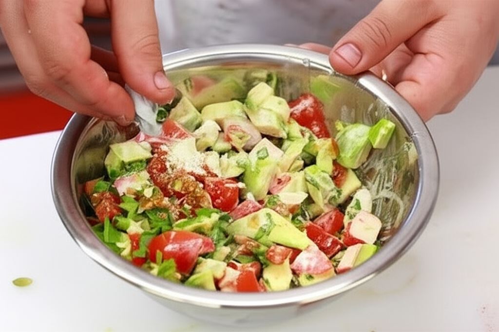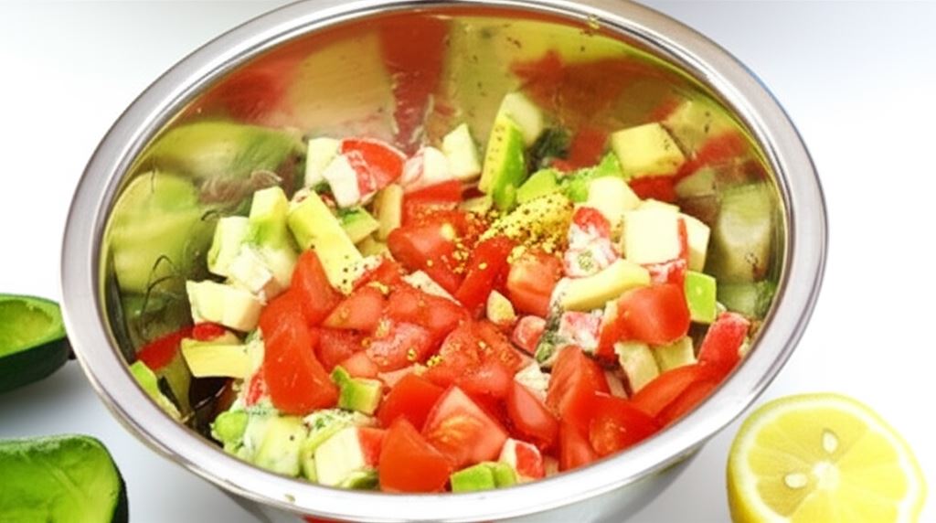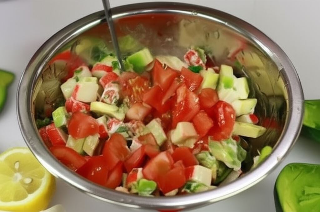 Pomidory potnij w kostkę, a natkę kolendry posiekaj. Z mięsa krabowego wyciśnij sok. Następnie miąższ awokado pokrój na drobną kostkę i umieść w misce.
